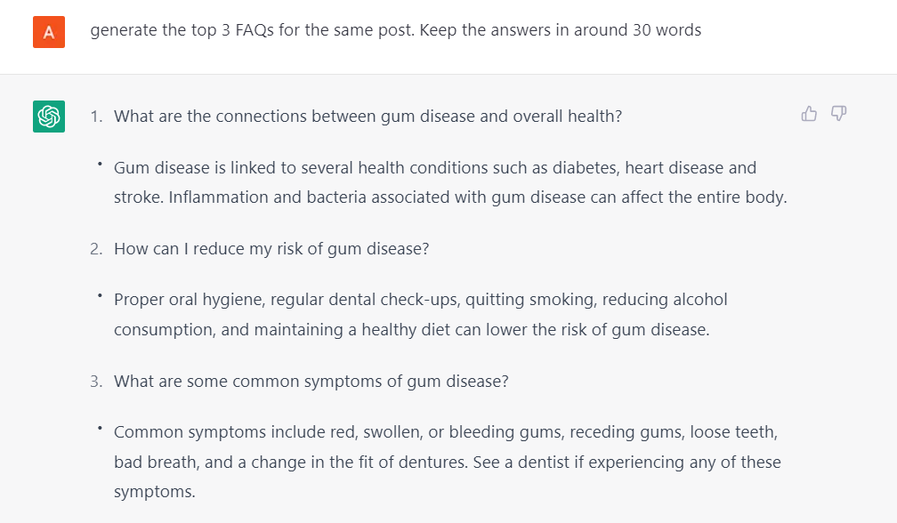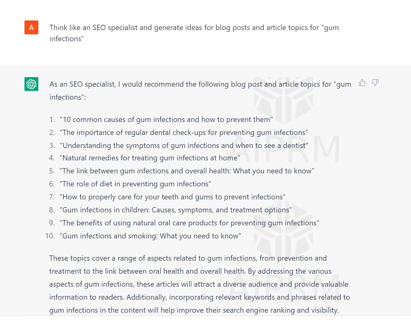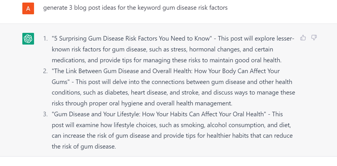 Your Input: Think like an SEO specialist and generate ideas for blog posts and article topics for “gum infections”