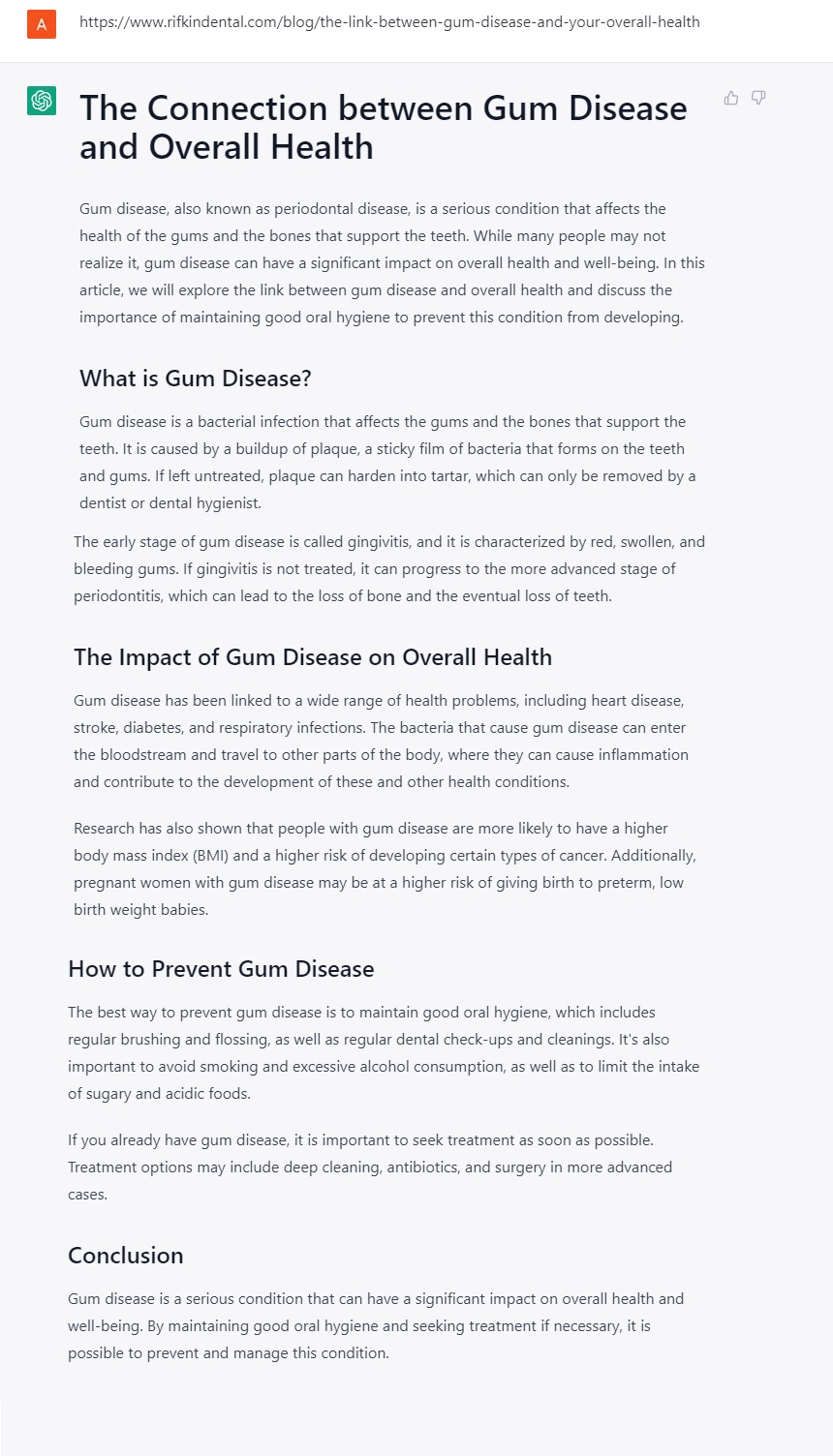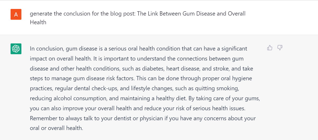 Your Input: Generate the conclusion for the blog post: The link between gum disease and overall health. This SEO prompt can assist you in finding content ideas. AI-generated content may not be 100% accurate, so we recommend proofreading the output, (example below).