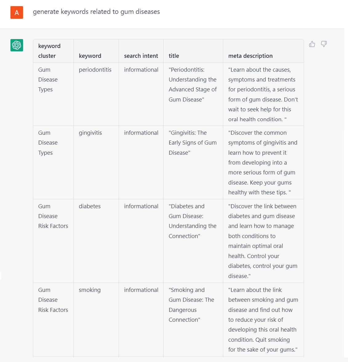 Your Input: Generate keywords related to gum diseases. You can find numerous results including keyword clusters, keywords, search intent, titles, and meta descriptions. Keyword research is made easier with the assistance of this SEO tool.