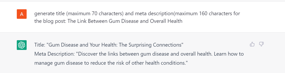 Your Input: Generate a page title (maximum 70 characters) and meta description (maximum 160 characters) for the blog post: “The link between gum disease and overall health”, (example below).