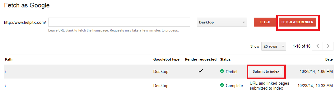 You need to first select Fetch option under the Crawl tools and then you need to enter the URL of the site that you want to check. If you want to test the homepage then you need to leave the field blank. Press Fetch and Render button so that the Googlebot will begin to crawl your website. Once the crawling is complete you can press the Submit to index button to see the detailed results of the indexing.
