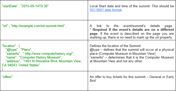 The following example describes some basic information about an IoT (Internet of Things) Summit, including the name, date and time, location, tickets and URL for more information