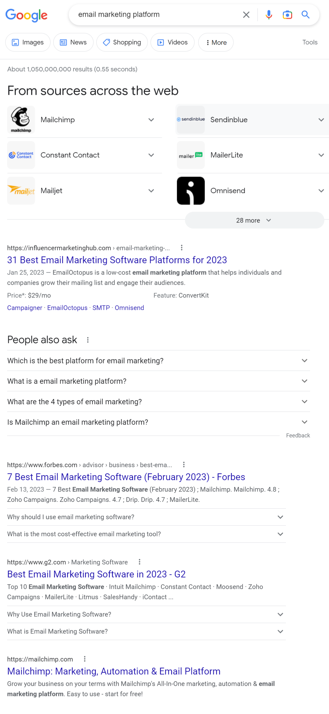 To start the research – let’s say you’re looking for keyword ideas for email marketing solution – type your main topic in Google Search and check the results. Most of the top results for “email marketing platform” have used keywords like email marketing software, email marketing tool, free email marketing tool, and more. This will give an idea of the keywords the top-ranking pages are optimized towards (example below).